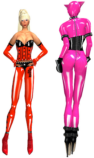 The bubblegum pink catsuit gives you two options, zipper open or zipper closed as shown here, the open version shows some nipples but they are under a nice coat of transparent pink latex.
