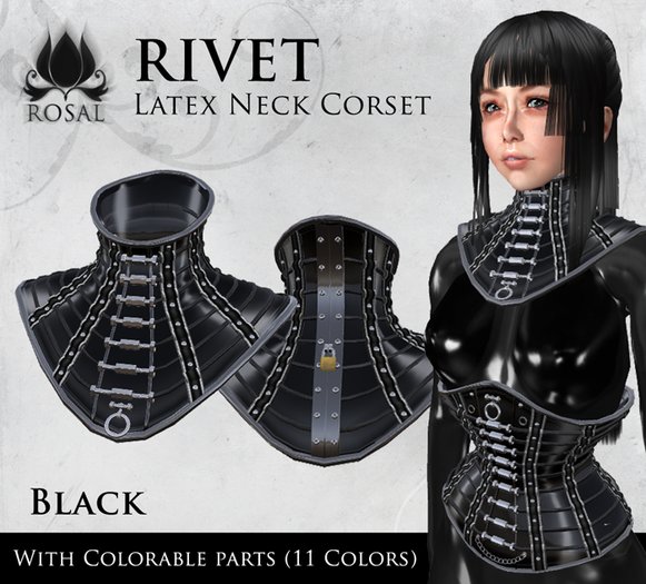 From top to bottom : neck corset first, though most option are in all the items, like the color change script that lets you change the colors of the prim parts on the corset, there are 11 colors to select from.