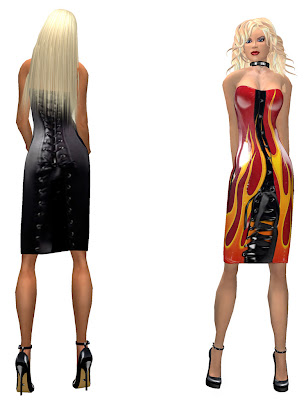 There are 4 versions of this dress, a red and black latex version, the black leather version Mistress is wearing and the fiery hot version i’m wearing.