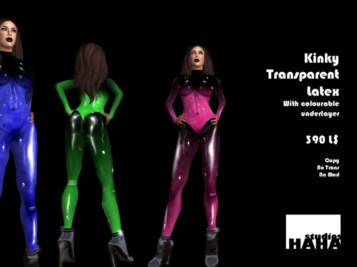 The first, Kinky Transparent Latex, is a clever idea. Two different transparent catsuits, meant to be worn over a colorable underlayer.