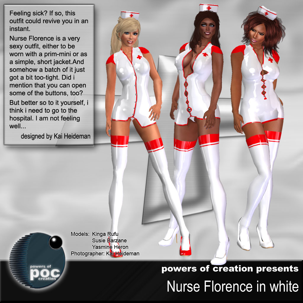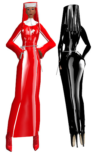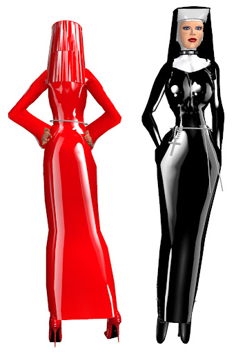 The prims are excellent, and shiny; this is latex, after all. There are eight versions with colored blouses and contrasting skirt (red blouse + white skirt, or skyblue bouse and black skirt, for example)